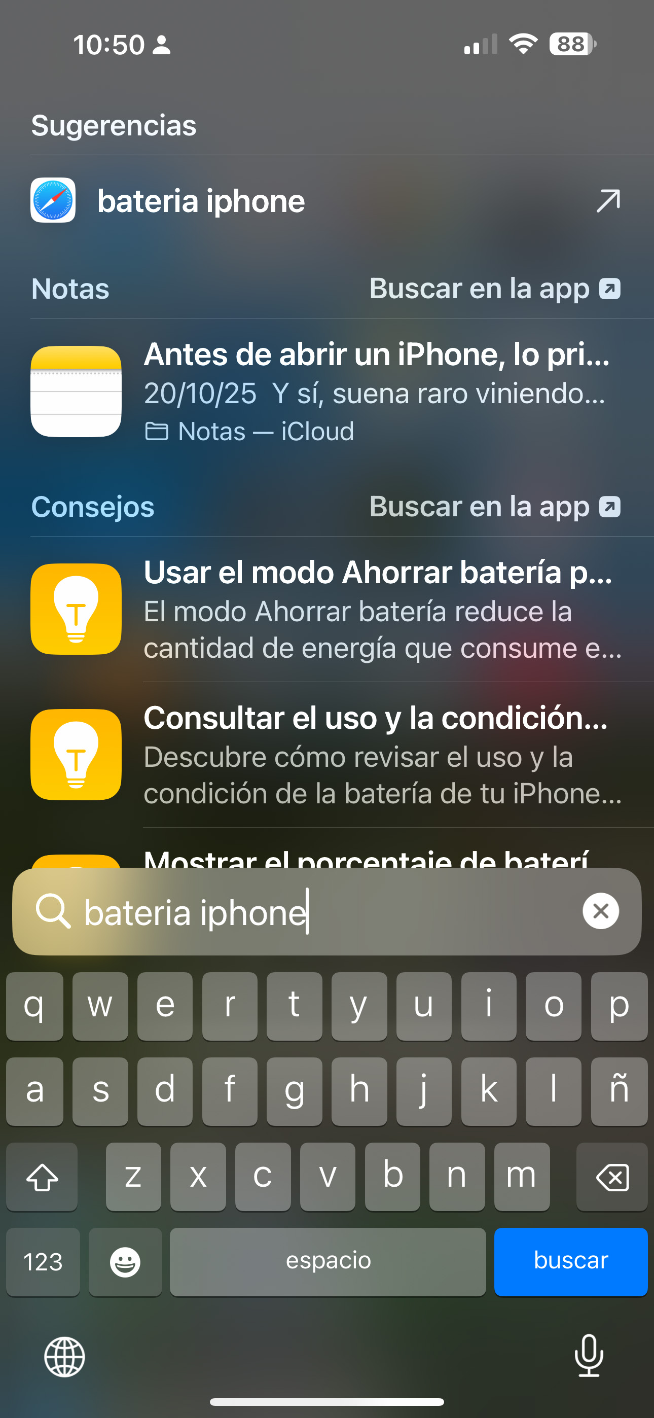 No solo sirve para buscar apps o contactos. Si deslizas hacia abajo desde la pantalla principal y escribes, por ejemplo, “batería iPhone”, “nota factura” o incluso “700 pesos”, Spotlight te muestra resultados dentro de Notas, Archivos, Mensajes o Recordatorios.
